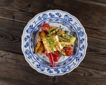 BREAKFAST: Breakfast is served in the form of a buffet. Hot and cold dishes are available, served with our homemade bread and rolls. We bake cakes, serve pancakes, crisp sweet rolls, eggs, homemade spreads, hummus, top quality ham, cheeses, coconut, oat, soy, nut and dairy milk, grilled peppers and tomatoes, fruit and vegetable salads and high-quality yoghurts, etc. We offer high-quality juice and subject to a surcharge, we can also prepare freshly-squeezed juice for you from oranges, grapefruit, apples, carrot or beetroot. We can also bake gluten-free bread on request. We serve filtered ILLY coffee for breakfast in blue onion porcelain mugs large and small.
